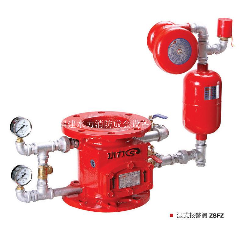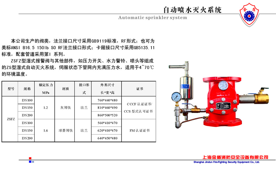 ZSFZ系统是一种常用的固定灭火系统,它由湿式报警阀、延迟器、水力警铃以及其它部件(如压力开关、水流指示器、闭式喷头等)组成。该系统长期处于备用工作状态,管网内充满压力水,当保护区域内某处发生火灾时,环境温度身高使喷头上的温度敏感原件(玻璃球)动作,密封组件脱落,自动启动系统,将水直接喷向火灾发生区域,并发出报警信号以达到报警、灭火、控火之目的。